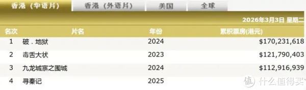 目前香港华语片影史前五名是这样的:第一名《破地狱》,1.7亿港元,黄子华主演;第二名《毒舌律师》,1.21亿港元,还是黄子华主演;第三名《九龙城寨之围城》,1.12亿港元,古天乐、林峯主演;第四名《寻秦记》,9619万港元,依旧是古天乐主演;第五名就是还在上映中的《夜王》。也就是说,前五名里,黄子华一个人就占了三个席位,而且冠亚军全是他的,这份成绩,在香港影史上几乎是独一份。